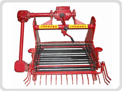 此薯類土豆收獲機是與手扶拖拉機相配套,一側力輸出(8-11馬力)拖拉機為動力,采用齒輪傳動,薯塊由輸送鏈輸送到機器尾部的震動側篩上,經(jīng)過篩動后滑落到機器前進方向的后側地面上以便收集。